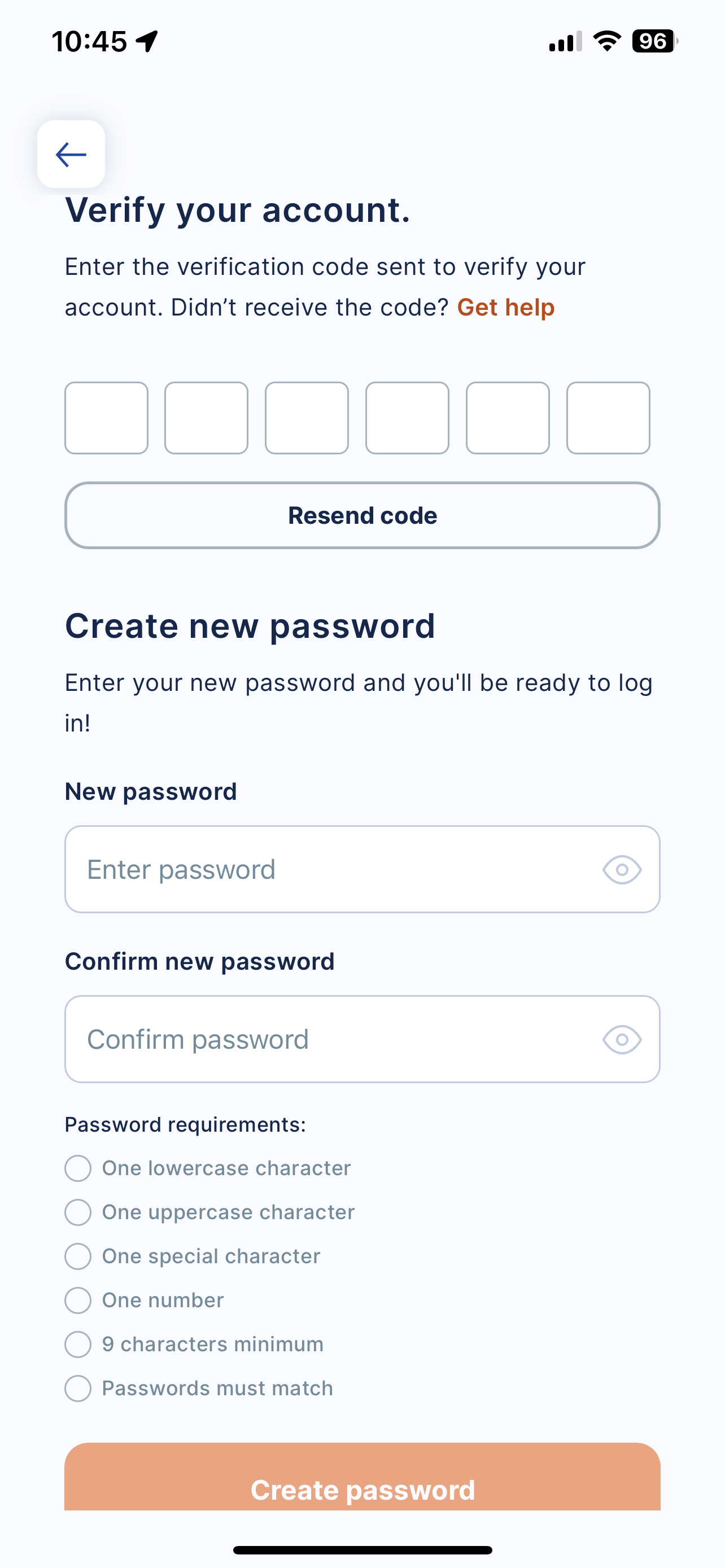 - Check your phone or email for the verification code, then copy and paste it into the box. Next, enter your new password and click Create password.